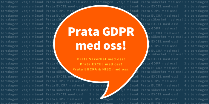 Med undantag för semester under juli och eventuella helgdagar så körs "Prata ___ med oss!" enligt följande schema under 2026. Klockan 12:00 - 12:45. 1:a torsdagen i varje månad: Prata säkerhet med oss! 2:a torsdagen i varje månad: Prata Excel med oss! 3:e torsdagen i varje månad: Prata GDPR med oss! 4:e torsdagen i varje månad: Prata EU Cyber Resilience Act (CRA-lagen) och NIS2/CSL-lagen med oss! De flesta aktiviteter spelas in. Du som inte är medlem i Dataföreningen kan i efterhand se ett urval av dessa inspelningar på YouTube-kanalen @securitydinosaur